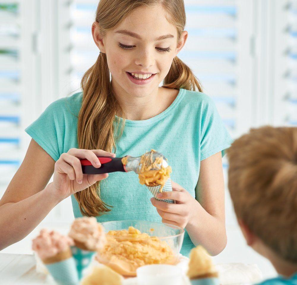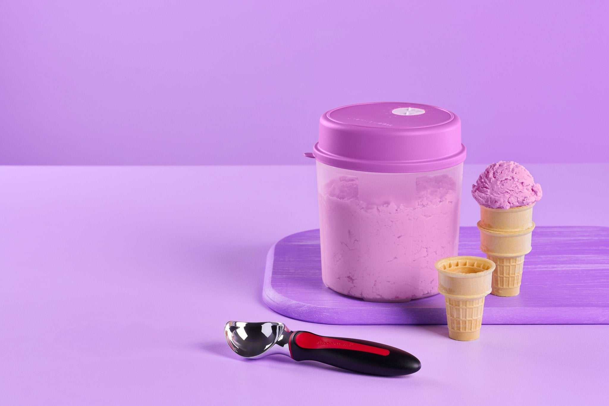 Crie cones de gelado perfeitos usando a colher de gelado Tupperware! A nossa colher de gelado é a ferramenta perfeita para servir todas as suas sobremesas geladas favoritas, como sorvetes, gelatos e, claro, gelado! Mas esta colher de gelado não se limita a sobremesas geladas. Pode usá-la para servir melancia, cantalupo, abóbora, massa de bolacha, massa para cupcakes e muito mais!