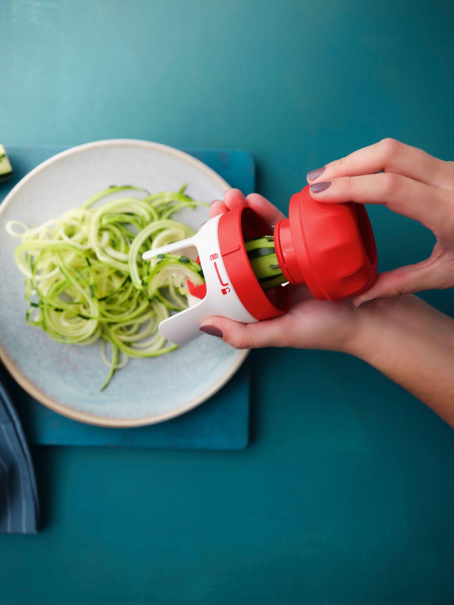 Incluir legumes nas suas refeições diárias pode, por vezes, faltar inspiração. A variedade é sempre bem-vinda e torna muito mais divertido cumprir os itens da sua lista de tarefas para a sua saúde. É exatamente isso que faz o Spiralizer. Uma pequena ferramenta prática para transformar legumes como courgettes, cenouras e pepinos numa forma apelativa. Funciona perfeitamente com cenouras, pepinos, courgettes, batatas e pastinacas. Não tenho nada contra massas, mas agora pode saborear todas as suas receitas favoritas sem se sentir culpado! Experimente um delicioso bolonhesa de courgette. Também pode preparar a sua salada para levar e fazer um salteado de legumes antes de enfrentar a noite! Toda a gente consegue! Impressione os seus amigos com pratos perfeitos. Mantenha o seu estilo preferido: cozinhe as suas noodles de legumes como quiser: a vapor, no forno, na frigideira ou no micro-ondas. O Spiralizer foi concebido para cozinhas pequenas! É pouco volumoso, por isso cabe em apartamentos pequenos. Vive o estilo de vida de um citadino em movimento? Não se esqueça de reabastecer a energia com refeições nutritivas que prepara em casa. Fácil de manter à mão e apanhar num segundo, para uma ou duas porções de noodles vegetarianas, tem tudo o que precisa com o Spiralizer. Ele domina as tarefas de cortar à sua maneira!