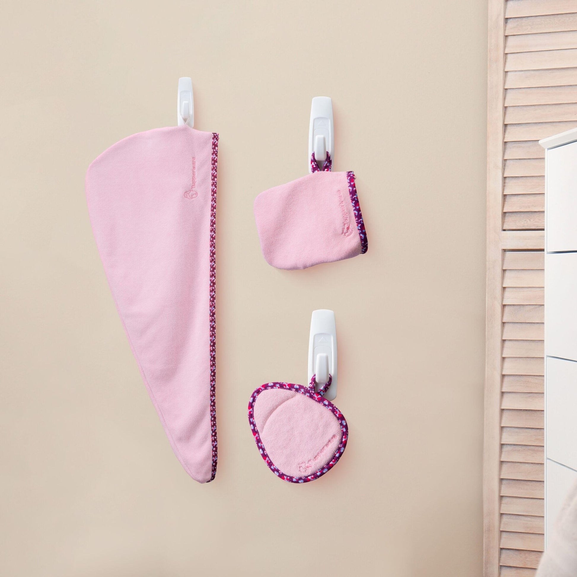 A Touca de cabelo em microfibras recicladas absorve até 5 vezes o seu peso em água para secar o seu cabelo mais rápida e eficazmente, protegendo-o do frisado. Poupa-lhe tempo e energia ao reduzir o tempo necessário para secar o cabelo.